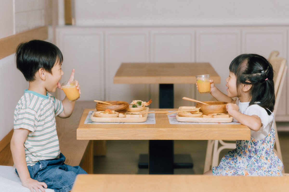 上餐之前提供法國品牌Super Petit,100%食用級矽膠餐墊,搭配色筆輕鬆在餐墊作畫,激發無限想像力,取代3C育兒。兒童餐具、水杯皆採用日本兒童餐具品牌MEROWARE,幫助學齡前的幼童學習自主用餐,莫蘭迪色的餐具配色培養孩童的生活美學素養。