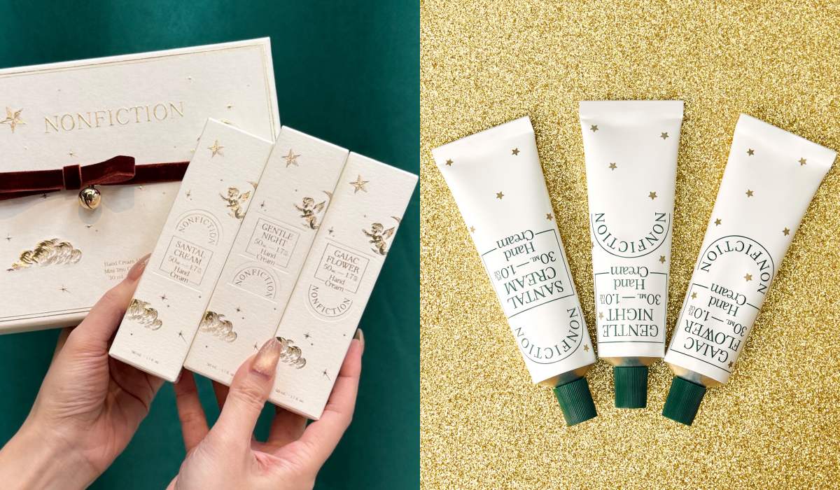 韓國小眾香氛品牌NONFICTION,今年聖誕節推出節慶限定系列,其中將明星商品護手霜精選3款最熱賣香氣:SANTAL CREAM、GENTLE NIGHT 以及 GAIAC FLOWER,換上限定包裝,絲絨般細膩的質地,好吸收不黏膩,還伴隨療癒的香氣,30ml容量很適合隨身攜帶。