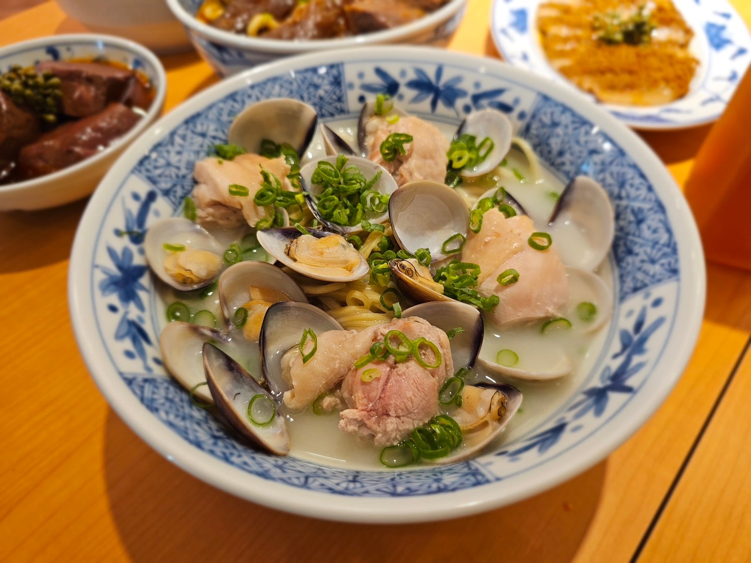 不吃牛肉的朋友也別擔心,這裡還有同樣受歡迎的「蛤蜊雞湯麵」!滿滿蛤蜊熬出的湯頭超鮮甜,搭配嫩口雞肉與Q彈麵條,每一口都能感受到滿滿的暖意。清爽又不失層次感,宵夜時來上一碗,完全是解酒、暖胃的首選!如果還覺得意猶未盡,店內還有多款滷味可以加點,像是豆干、甜不辣、白蘿蔔,搭配熱湯一起享用更過癮~