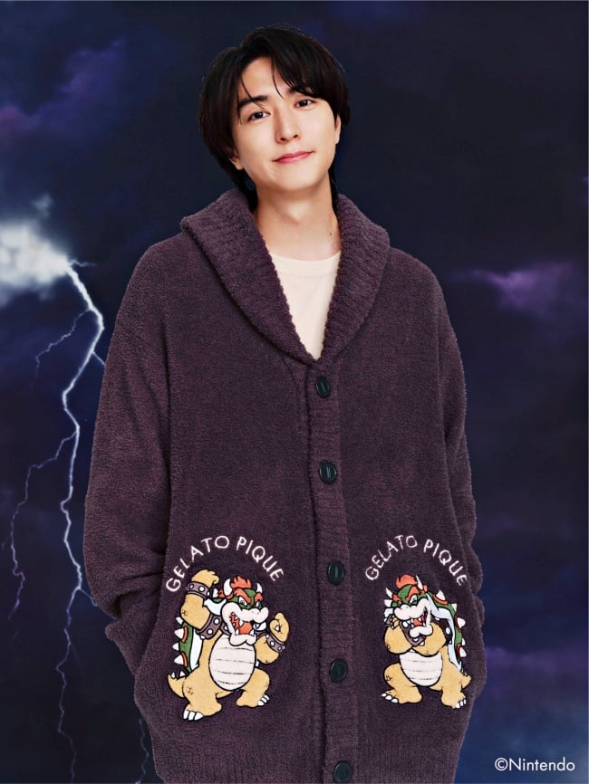 瑪利歐爬出水管的瞬間被定格裝飾在居家開襟外套上,還把鈕扣做成「金幣模樣」,扣起、解開外套的每個瞬間,等於都在開外掛吃金幣,這波首度請到大魔王「庫巴」光明正大野生出沒,在外套上爆怒明明很邪惡卻自帶反差萌,跟男友或家人一人一件相愛相殺吧(笑)!另外還打造出,結合了同伴和敵人角色的滿版印花居家套裝,分別有黑白版以及彩色版,用線條點綴超有童趣感~
