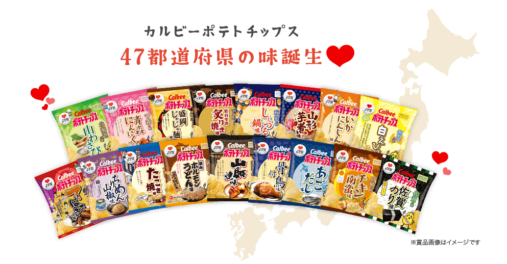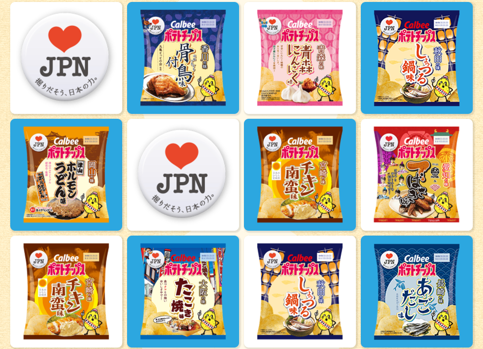 而一向很(會賺錢)貼心的日本,早就料到這點了!日本洋芋片品牌卡樂比,最近推出了一個「♥ JPN(LOVE JAPAN)」計劃!因為想讓孤身在異鄉奮鬥的人們隨時隨地都能品嘗到家鄉的味道,而開發了這系列全新的「47都道府縣之味」的洋芋片!
