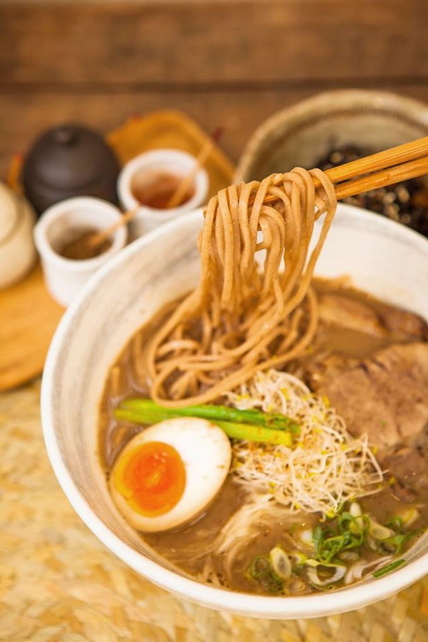 緣enishi拉麵的口感及風味皆相當獨特,這是因為老闆堅持自製全麥拉麵,與一般奶油白的Q彈拉麵有所不同。