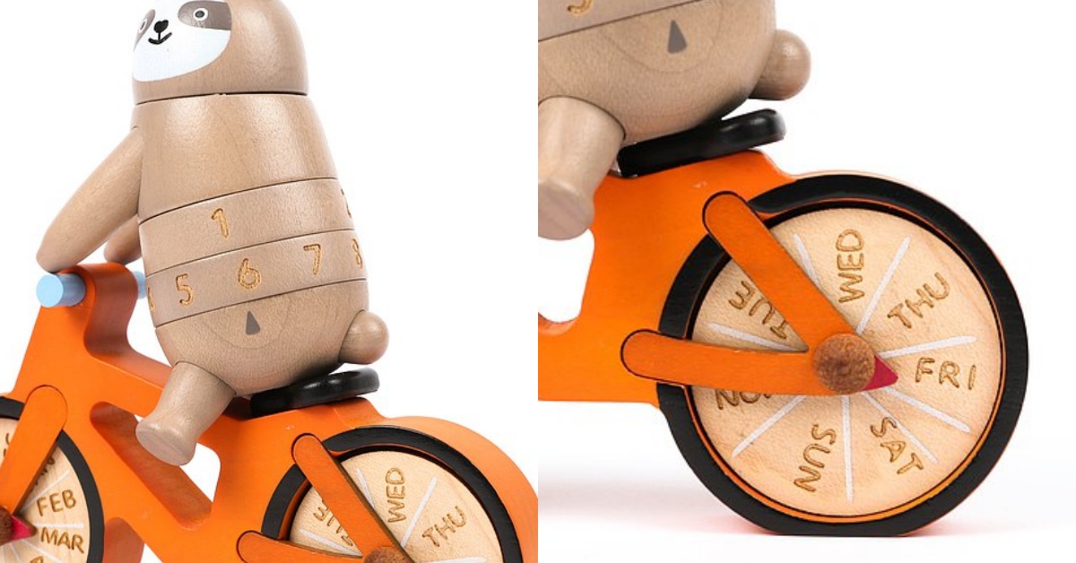 樹懶怎麼跑來騎卡打掐(腳踏車)啦!「樹懶單車」萬年曆為Wooderful life原木品牌設計製造,只要轉動樹懶的身體就能調整日期、腳踏車前輪為月份、腳踏車後輪則為星期,妞妞們可以配合每天日期使用,即便不拿來當立體桌曆,充當成桌面擺飾也非常可愛呢!妞妞們有發現嗎~原來樹懶的腳腳短到幾乎踩不到腳踏車踏板(歪樓XD)。
