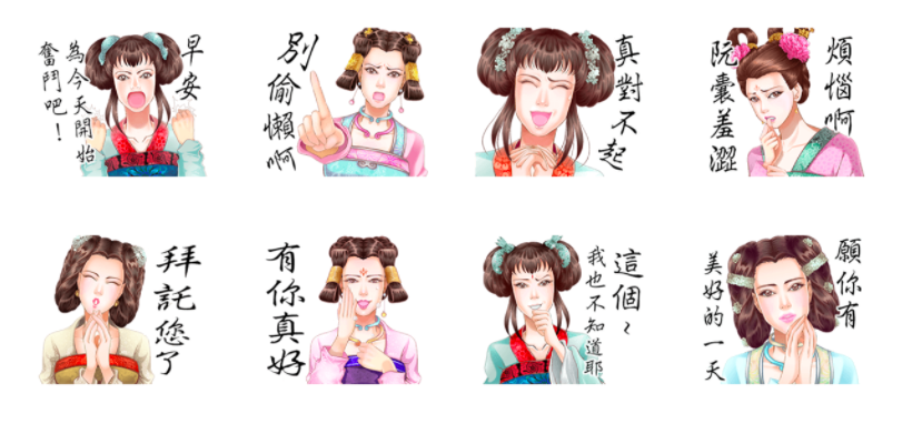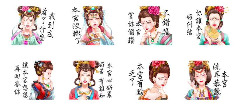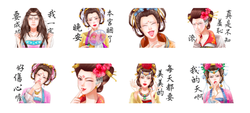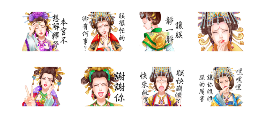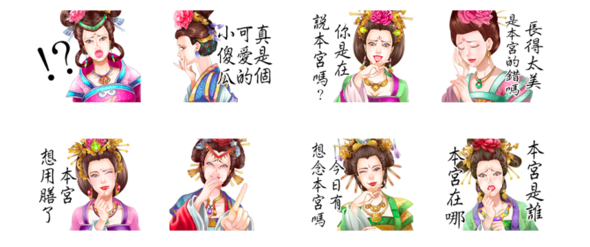 登上帝位之後整個霸氣外露,還不快臣服在則天大帝的腳底下!手機小姐覺得這個貼圖作者超用心,不但服裝跟髮型很考究,造型也幾乎都沒有重複,真的很不簡單!如果妞妞是古裝控,手機小姐很推薦這款華麗又勵志的貼圖,快跟著媚娘一路往上爬吧!