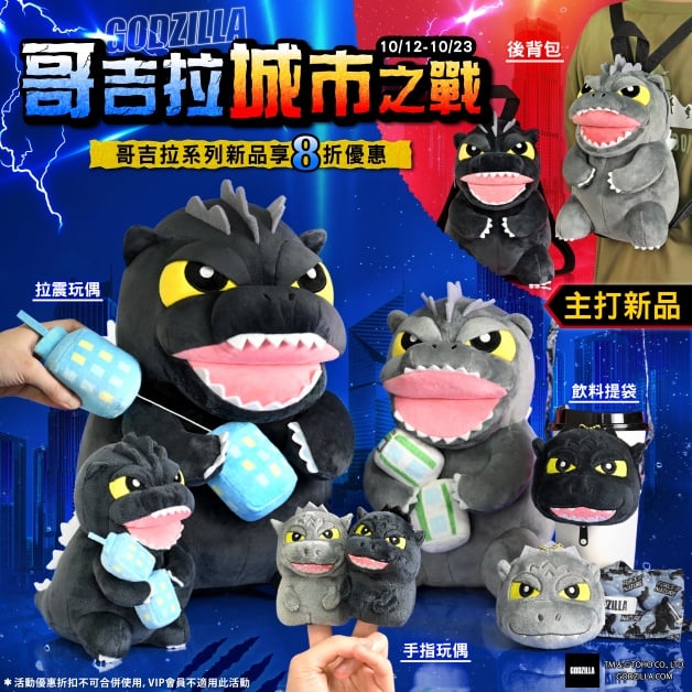 為歡慶KHTOY「哥吉拉 城市之戰」系列強勢登場,10月12日至10月23日期間,哥吉拉新品(玩偶/指偶/飲料提袋)全面享8折優惠,強力主打的吉拉後背包則限時優惠8折,要搶要快啊!