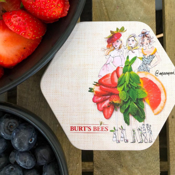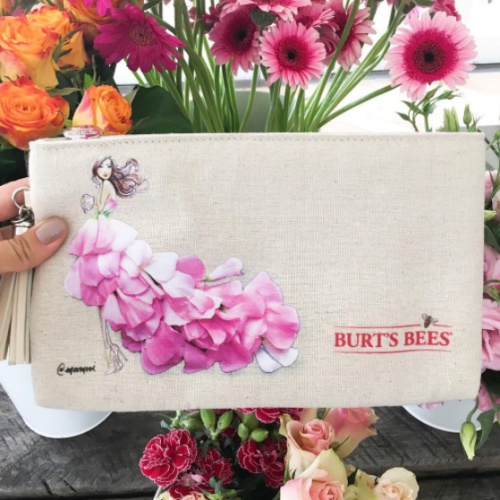 你沒看錯,他的插畫作品最近就與知名品牌Burt’s Bees做了聯名設計,這身花朵長禮服實在美得不像話啊!(想要這個化妝包啊啊啊)