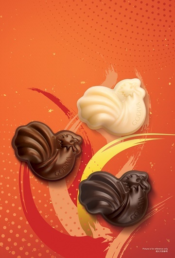 2017GODIVA新年系列巧克力採用了靈動的公雞造型,象徵朝氣和活力。其中精心挑選了不同風味的亞洲水果作為內餡,包括清新的橘子、楊桃、山竹。於農曆新年贈送水果代表祝願親朋好友身心安康;GODIVA新年系列巧克力定能為您的親朋摯愛帶來甜蜜和祝福,朝氣勃勃地迎接新一年的來臨。
