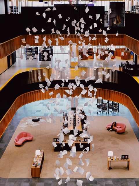 最印象深刻就是懸掛在三層樓高天井處的「陣風」,由英國藝術家團隊保羅.考克斯基(Paul Cocksedge)所創作的公共藝術,無論從館內哪一個角度看都吸睛