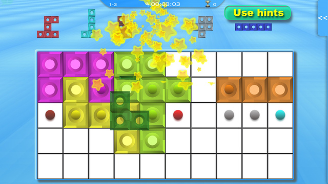 有點類似俄羅斯方塊,你要把不同形狀的積木放進盒子填滿。雖然不限時但越快完成才能得到高分,遇到瓶頸可以使用提示功能唷!