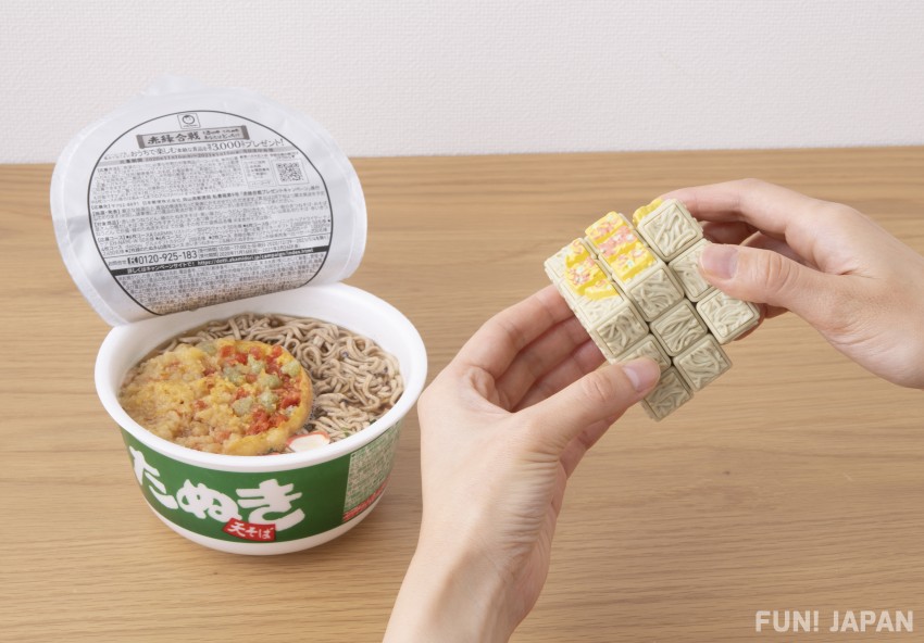 「Maruchan天婦羅蕎麥麵魔術方塊」的包裝不僅看起來與真的商品相同,且打開蓋子時,利用 3D 列印製作的魔術方塊,造型就是天婦羅和麵條的結合。當然,這款沖了熱水也不能吃。比起一般魔術方塊,因為外層多了天婦羅的造型,難度相對來說也提升不少,必須要正確的將天婦羅組合完成才算成功。