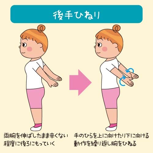 將兩手向後伸,高度控制在肩膀不會覺得不舒服的位置即可。接著像是在說再見一樣上下扭轉手臂,就是蝴蝶袖掰掰操了。