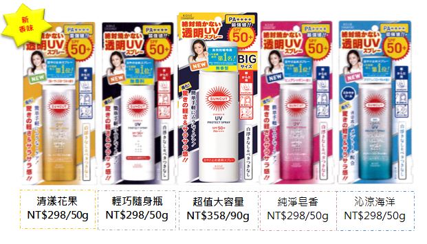 SUNCUT UV曬可皙的人氣商品~高效防曬噴霧,在今年除了持續推出男生、女生皆愛用的無香味之外,受到廣大女孩喜愛的純淨白潔淨皂香以及夏季沁涼海洋清香也都有新版的推出,更有全新超吸精的金黃色系的清漾花果香氣選擇,防曬之餘,還能時時保持怡人香味。