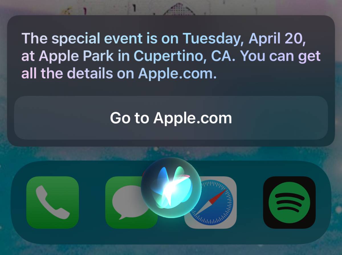 其實此次消息算是Siri先劇透,國外用戶以英文詢問Siri「When is the next Apple event?」,竟意外得知「4月20日蘋果將在Apple Park舉辦特別活動」,手機小姐後來實測也得到相同結果(台灣用戶需將Siri語言調成英文),在走漏風聲(?)沒多久之後,蘋果便正式發出春季發表會的邀請函!