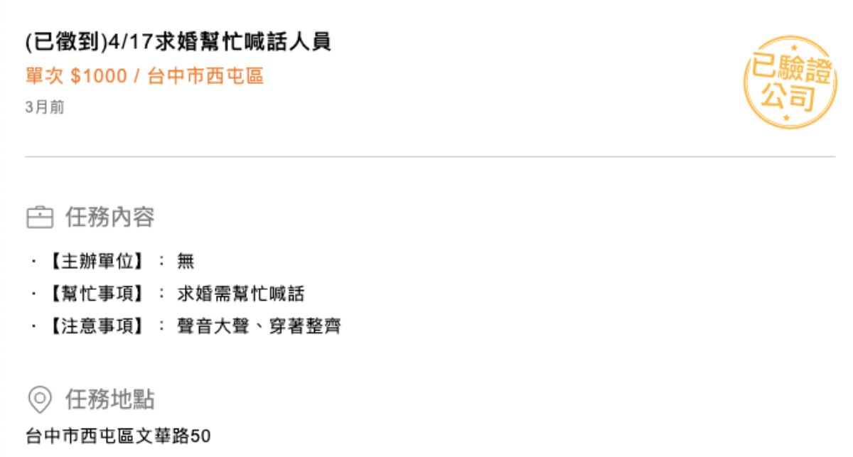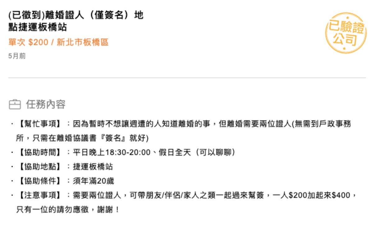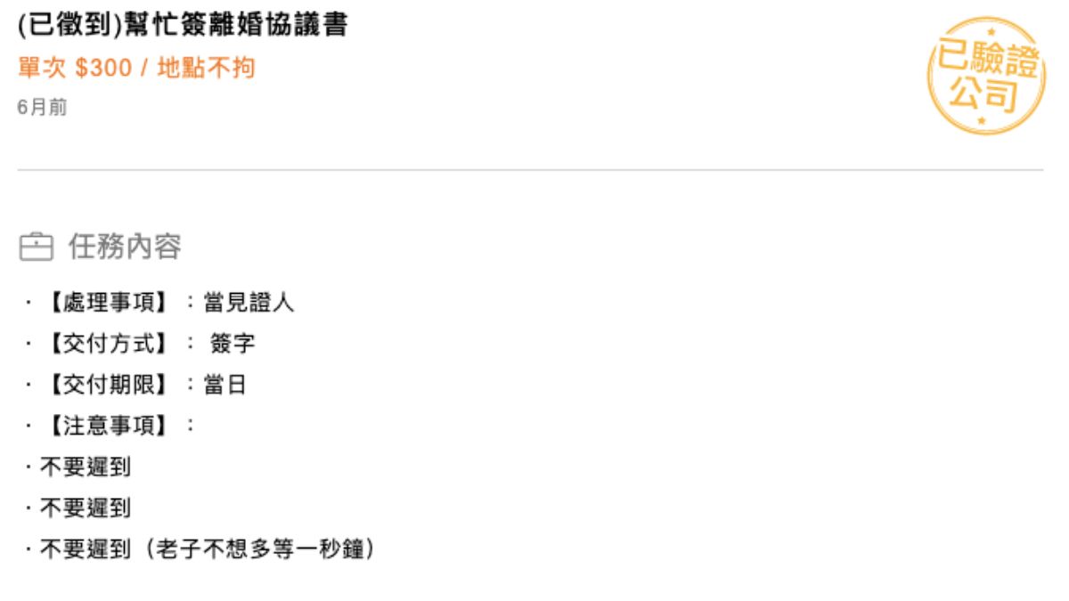 有人需要幫忙求婚,當然也有幫忙離婚的服務啦!許多人離婚不想讓週遭的人知道,但需要兩位證人時又不知道找誰,這時候求助網友準沒錯~不過好笑的是,還有人特別備註不想多等,到底是多討厭這段婚姻(笑死)。