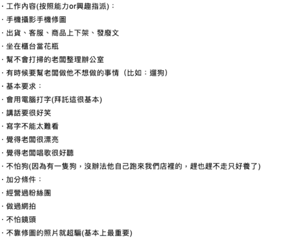 最後一個,不知道是雇主太誠實,還是他想幽默一下,直接在職務上打「徵長期花瓶」,內容還寫說要幫老闆做他不想做的事情,比如遛狗,還要求講話要很好笑、覺得老闆很漂亮、唱歌很好聽,嘉義的花瓶們,真的不考慮一下這個工作跟這有趣的老闆嗎?(笑到不行)