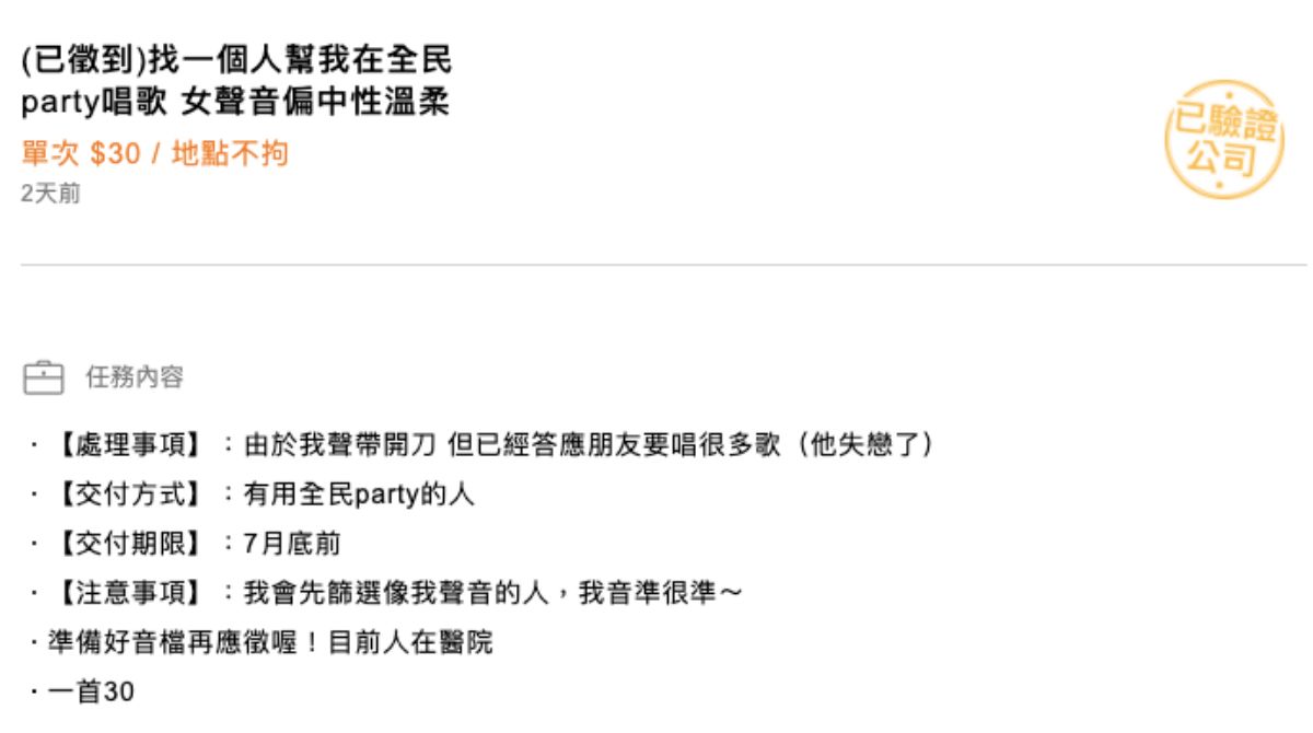 教唱歌、學唱歌算很常見,但是幫忙唱歌妞編輯倒是第一次看到,而且還是要別人幫他在《全民party》App裡面唱,原因是要陪伴朋友失戀,不過既然是朋友難道不能稍微緩緩嗎?聲帶開刀還硬要逼你唱的根本不是朋友吧!