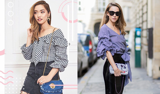 又是一件今年必備單品:格紋荷葉露肩上衣!而且是各品牌不約而同推出,右邊這款簡直每位街拍潮女一人一件,夯度爆表。