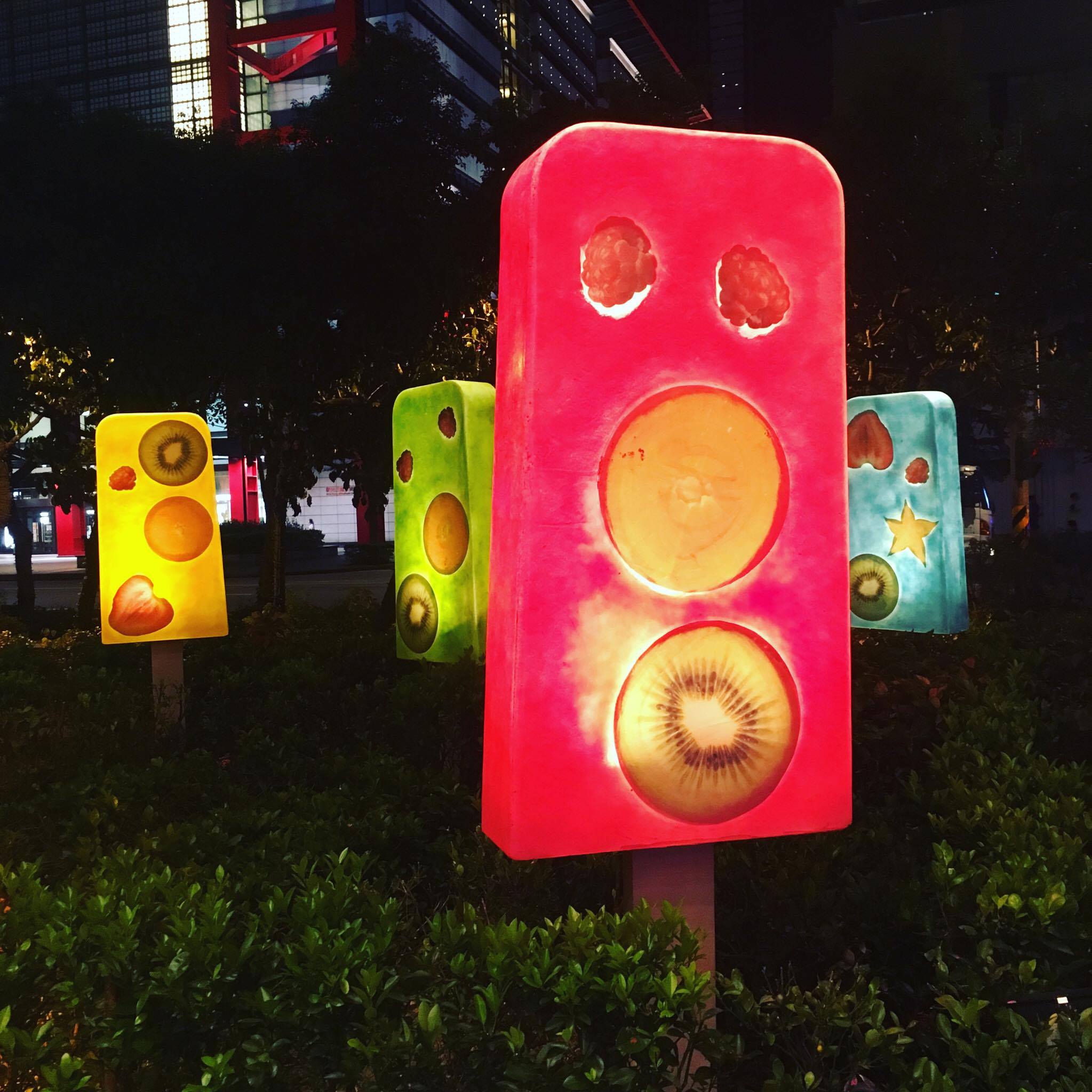 如果女孩們覺得外頭天氣實、在、太、熱、了!沒關係~新光三越裡面還有這支巨大的玫紅冰棒,可以盡情地拍到爽!或是下班後在這寧靜的夜晚下,每支冰棒也跟著閃閃發光呢~(白天和晚上的冰棒有著不同的風情呢~身為網美的妞編輯當然要都收集到啦!)