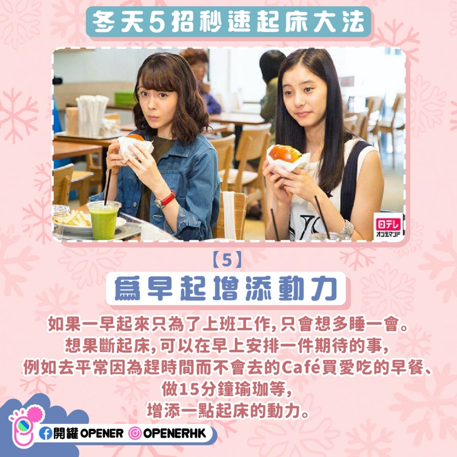 如果一早起來只為了上班工作,大家都只會想多睡一會,想要果斷起床,可以在早上安排一件期待的事,例如去平常因為趕時間而不會去的咖啡廳買愛吃的早餐、做15分鐘瑜珈等,增添一點起床的動力。
