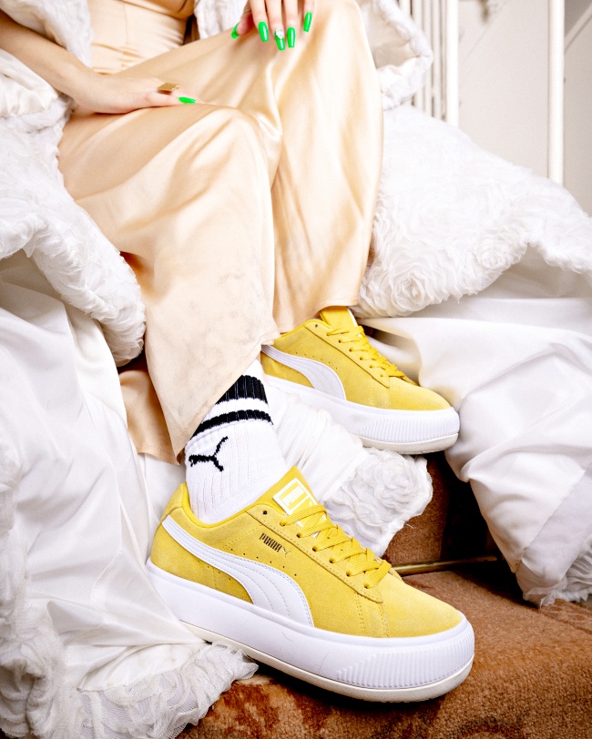 PUMA家的爆款復古龐克厚底鞋「SUEDE MAYU」,受封女孩們的大長腿神器,超厚實氣勢鞋底+奢華麂皮絨質鞋面一雙就自帶鎂光燈效果,今年春夏推出「蜂蜜奶油黃」新配色,白色大底搭配活力四射的黃,在陽光的照射下每一步都閃閃發亮~