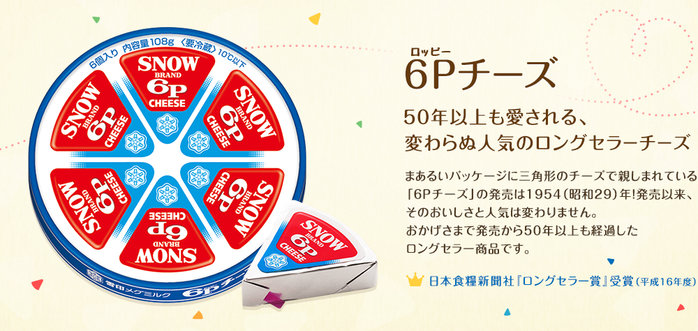 日本的雪印乳酪是第一個將乳酪分成六等份的乳製品企業,之後雖然有很多品牌紛紛效仿,但6P乳酪的形象深植人心,幾乎是每個日本人小時候營養午餐的必備良伴,不管是夾在吐司裡或抹在麵包上都很好吃,甚至有一些爸爸會把他夾在燒海苔裡配酒呢!據說吃起來會有一種療癒、放鬆的港覺~