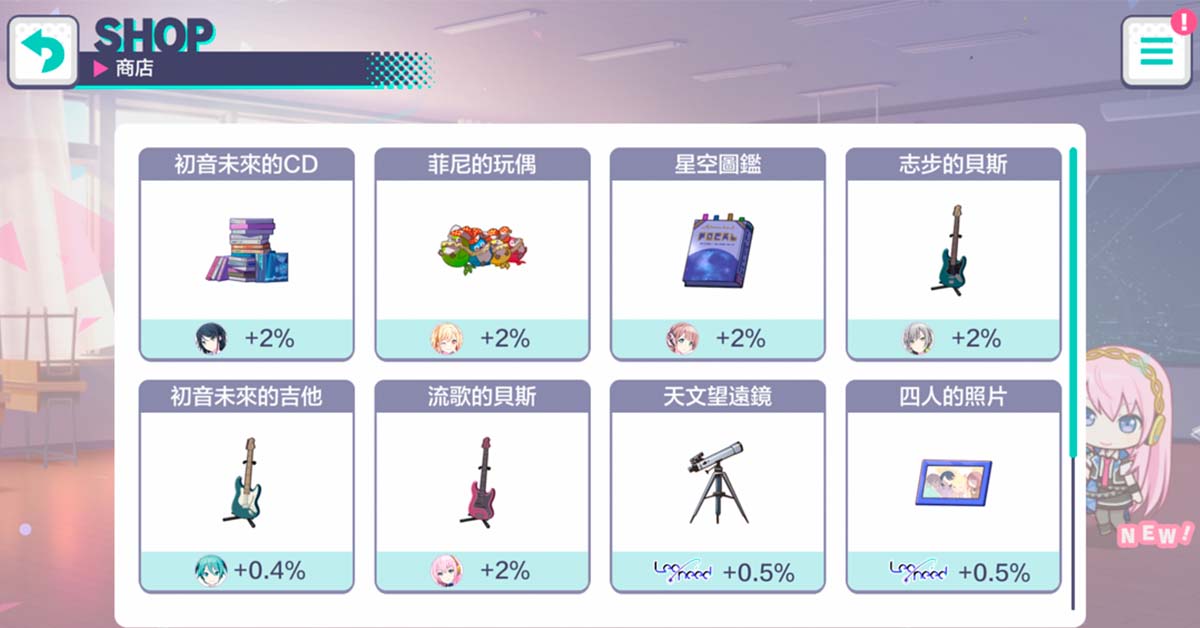 每個「世界」中都存在著道具商店,找到初音未來的玩偶並點擊就能進入,商店中有各式各樣的區域道具,交換區域道具不僅能裝飾世界,對應角色或是團體也能獲得相應的綜合力提升效果。