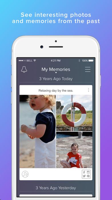 你是喜歡觀看臉書動態回顧的人嗎?想知道一年前的今天發生什麼事,只要下載《 Memoir 》就能同步你的相機膠卷、Facebook、Twitter、Instagram、Foursquare、Dropbox 以及Mac,重溫過去發生的生活大小事。