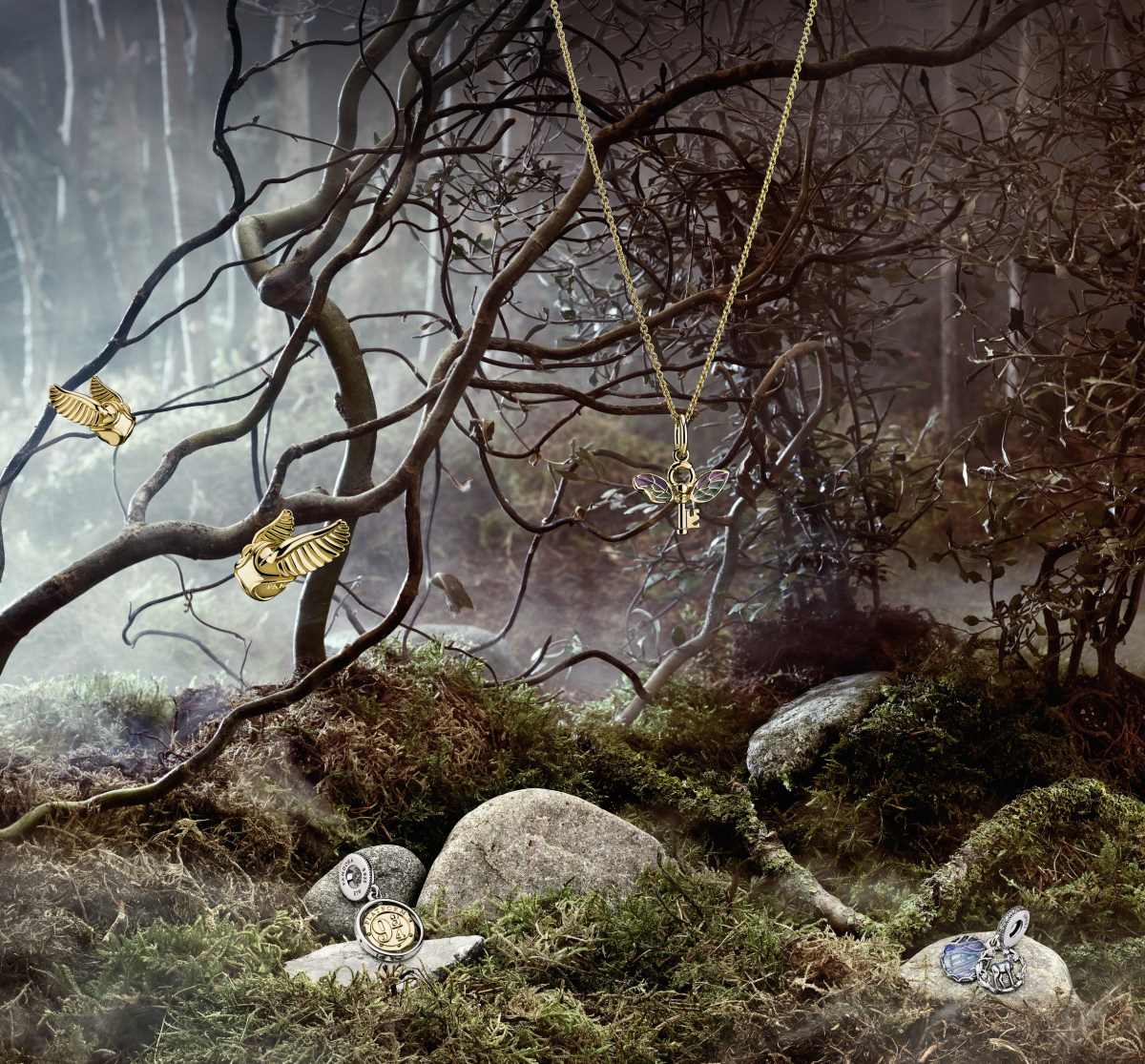 以守護魔法石的飛天鑰匙為設計靈感,在鍍14k金鑰匙上加上了鏤空琺瑯翅膀,翅膀細節設計源自於哈利騎上房間中的飛天掃帚,半透明的透光效果看起來精緻又生動,更有一種類似染色玻璃般的夢幻色澤;還有一款由貓頭鷹嘿美與經典9¾月台標誌的旋轉雙面墜飾,也很具代表性。