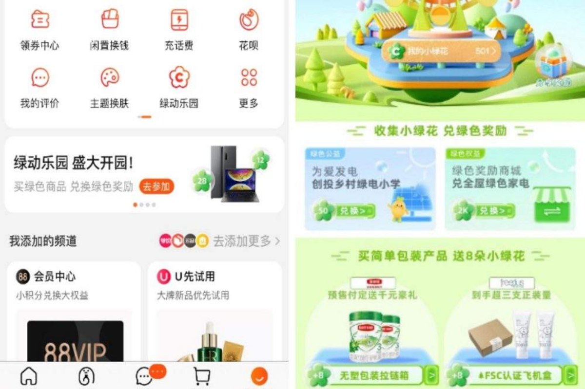 淘寶天貓618期間,基於綠色消費的互動平台「綠動樂園」正式在淘寶APP上線。消費者在淘寶天貓購買打標綠色商品、選擇「簡單包裝」等,都可以從「綠動樂園」獲得相應數量的「小綠花」。消費者用「小綠花」可以兌換環保商品如全屋綠色節能家電和綠色有機食品等,或者參與綠色公益項目。