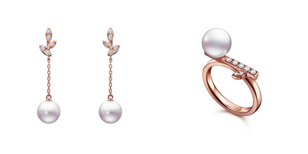 (左起)TASAKI kugel耳環櫻花金、鑽石、阿古屋珍珠 NT.51,000、TASAKI kugel戒指櫻花金、鑽石、阿古屋珍珠 NT.83,900