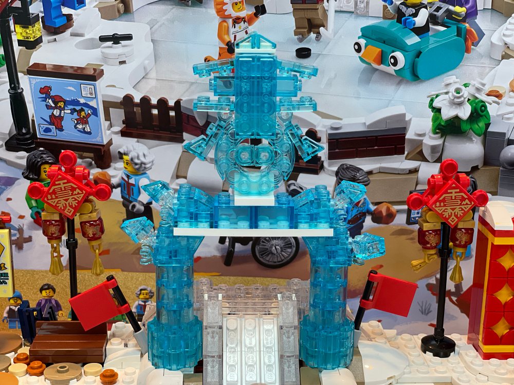 「新春冰上遊」尺寸較大,高17公分、寬39公分、深26公分,積木零件數共1519塊,以年節時的「溜冰場」為主題,細緻展現積木冰湖(湖內還有魚)「春」字冰雕與溜滑梯、被白雪覆蓋的樹木與器材出租店等場景,還有吸睛十足的「虎年打卡點」,也是一款互動性相當高的盒組。
