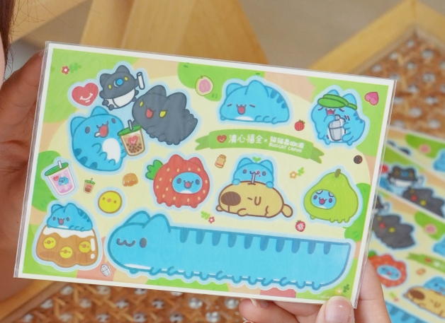 除了飲料提袋、別針外,7月29日起只要單筆消費滿200元,就贈送「咖波貼紙」一張,滿400元贈兩張、以此類推;變身各種模樣的咖波,不管貼在哪都相當療癒~
