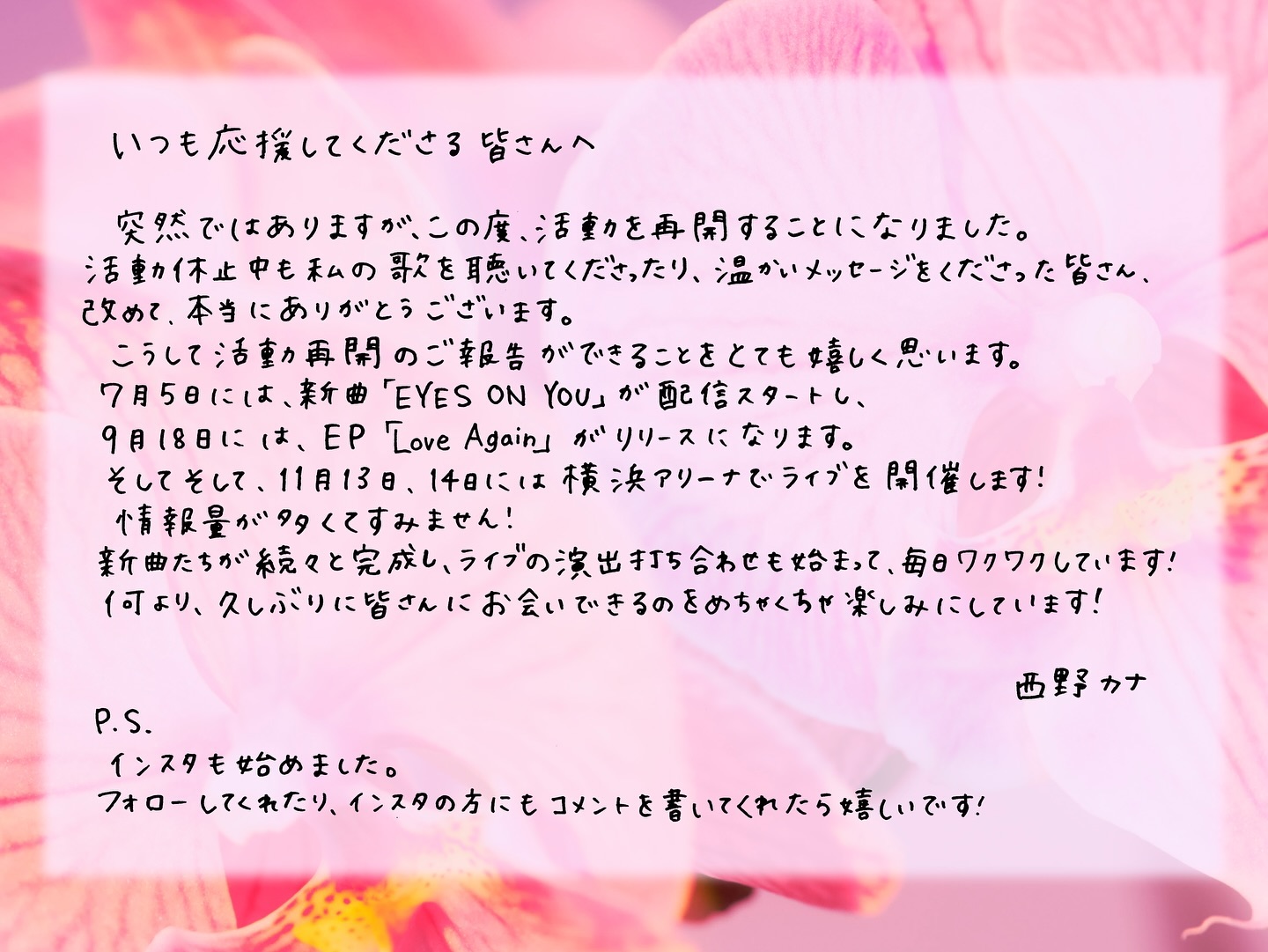 在手寫信中,西野加奈也透露自己將在7月5日發表新歌〈EYES ON YOU〉,且會在9月18日發行EP《Love Again》。此外,她還將在11月13-14日於橫濱arena舉辦一連兩天的復出首場演唱會。不得不說,這個資訊量真的要超載啦!