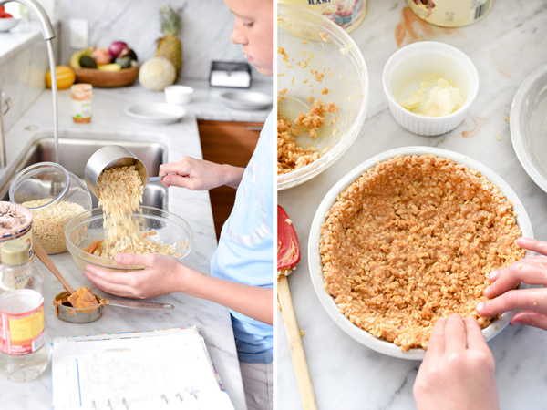 再拌入2杯自己喜歡的穀物,像是玉米脆片、燕麥穀粒或是膨化的米粒,這時候只需要輕輕地倒入淺盤或派模,均勻壓平成派型。