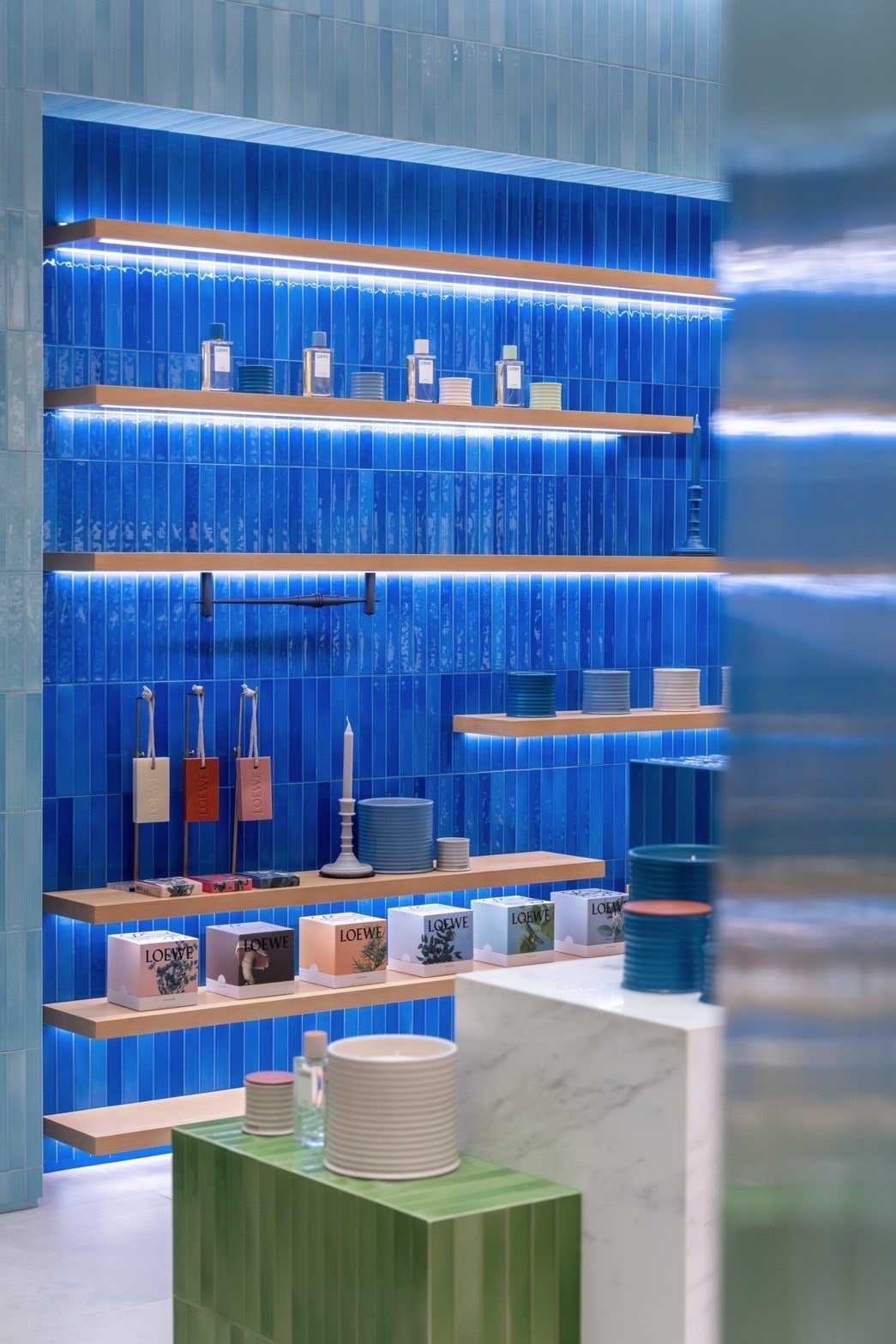 走進這家全台首間LOEWE香氛獨立店,雖然袖珍但細節感卻滿滿,店內一整面的塗釉陶瓷牆面及展示臺,都是從西班牙原裝進口。先由工匠在工廠將這些塗釉陶瓷依照顏色深淺、光影的變化進行排列確認,再到店上一塊一塊的拼貼而成,打造這間充滿沈浸式體驗的空間。