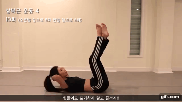 之後把腳整個抬高,呈現90度的模樣,一樣做10回仰臥起坐的動作!雖然這個動作相當吃力,但一樣要記得放鬆脖子和手部的力量喔!