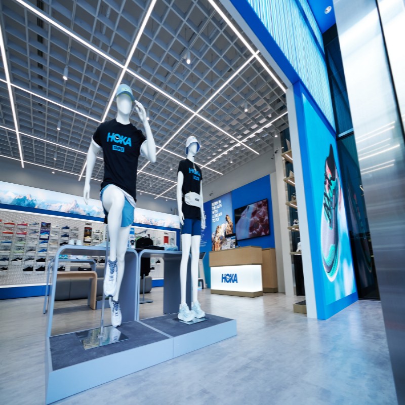 致力服務跑者的初衷充分展現於門市打造上,外觀以玻璃帷幕注入藍色、金屬元素勾勒視野通透的未來科技感,遮棚採流線設計呼應HOKA弧形大底、緩震科技等核心技術,並以充滿運動能量的HOKA跑者主視覺傳遞品牌「We Are All Born To Fly」的Fly Human Fly精神。內部則採用明亮、挑高5米的寬敞空間,為同步全球店裝更進口全球最新原裝道具,並以全新發光鞋牆襯以層巒疊嶂的群山展售全系列鞋款。當然,具指標性地位HOKA遠東Garden City門市也躋身為販售品項最齊全的門市,除了Trail、Road、Hike、Lifestyle等多元系列,最受潮流愛好者注目的「MAFATE LIFESTYLE 潮流系列」,也以最完整的系列牆面讓人一次看足。此外,遠東Garden City門市同樣引進最新型「3D足測機」,只需30秒就可獲得完整足型分析結果,再搭配個人運動需求推薦專屬的命定鞋款,讓HOKA帶你輕鬆駕馭各種跑步穿搭!