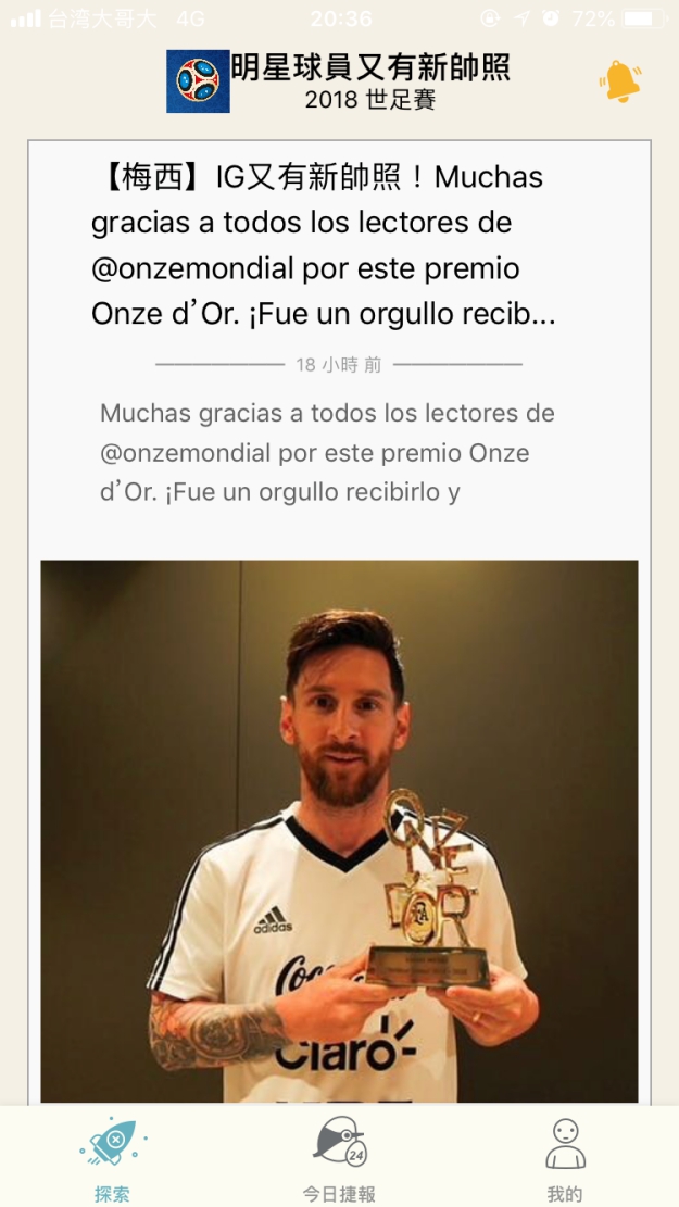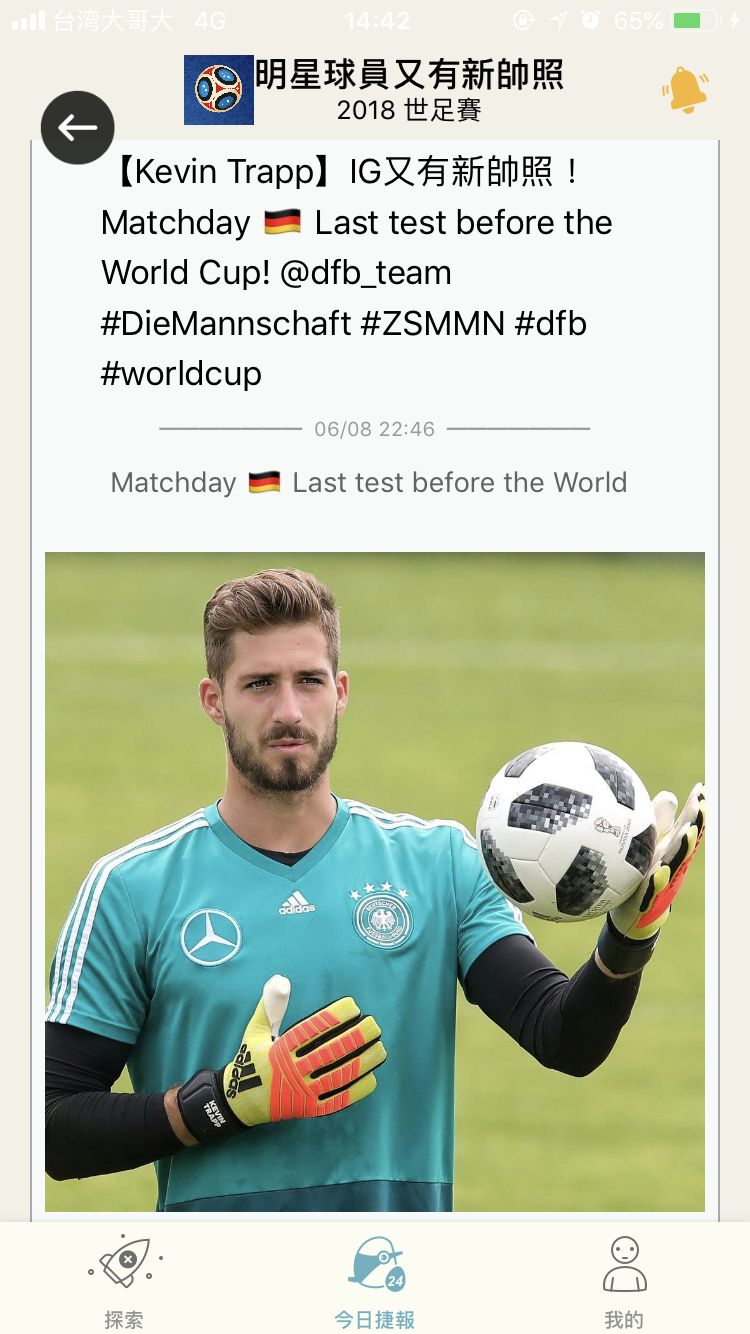 如果要一次搜羅支持隊伍的最新賽事消息與明星帥照,點到「今日捷報」就能知道囉~那麼最後就預祝大家觀球與欣賞球員愉快,讓我們一起為世界盃足球賽歡呼!