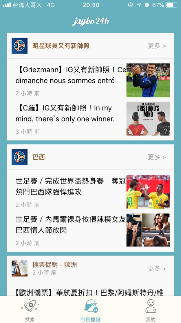 《Jaybo捷報》收錄了抓寶、搶廉航機票等各種生活資訊,只要訂閱個人喜愛的情報,並利用即時通知的功能,就能隨時都能掌握最新資訊。最近它也為了世界盃足球賽推出了更新,加入了世足的通知服務啦!