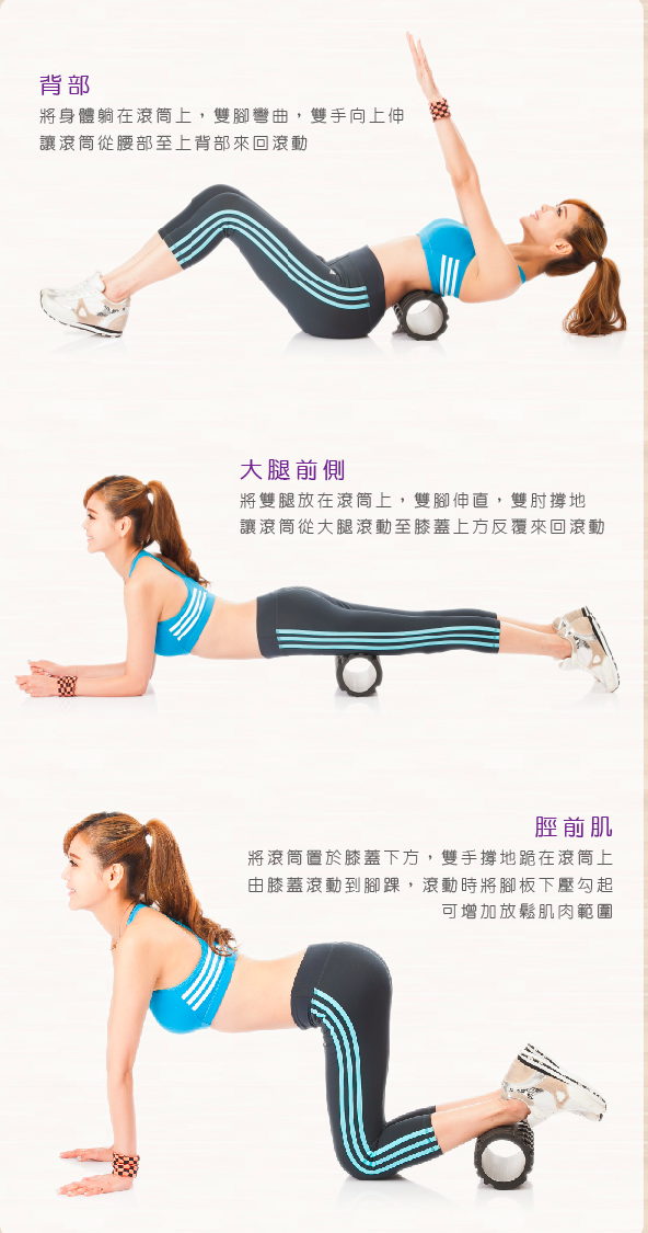 肌肉疲勞時,從臀部、大腿後側、小腿、背部、大腿前側及脛前肌一一擊破,滾一滾,消疲勞、腫脹、酸痛通通有感!(運動前後用也可以喔!加速熱身&收操,結塊的緊繃肌肉秒放鬆!)