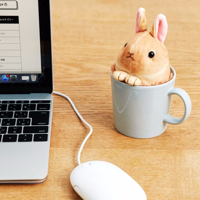 這款毛毛的兔子娃娃,其實是電腦刷。平常放在杯子裡時看起來像是普通的兔子玩偶,其實下半部是能夠吸附灰塵的布料,可以用來清潔螢幕跟鍵盤。工作累了的時候,就把牠拿起來清清電腦,放鬆一下心情吧!