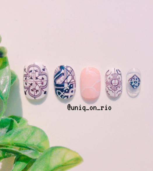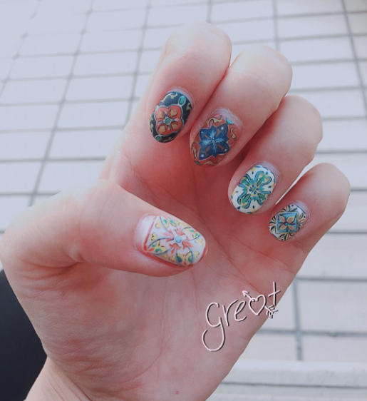 除了把花紋畫在指甲上之外,像這樣把整塊磁磚畫上去也超可愛的!