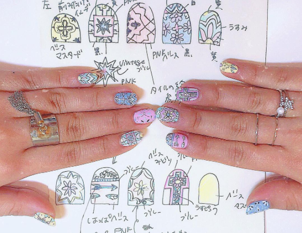 磚花指彩畫起來可是一點都不容易呢!要畫出華麗又對稱的磚花,美甲師還要先畫上草稿構圖!