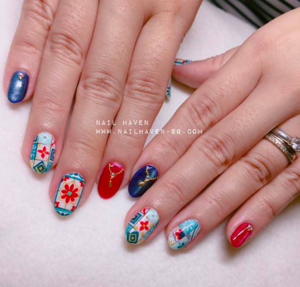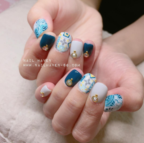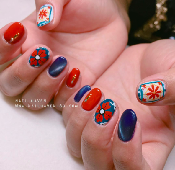 「磚花指彩」顧名思義,就是把磁磚的花紋畫在指甲上,華麗感十足又整齊有秩序的磚花,就像萬花筒一樣呢!