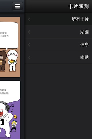 首次開啟LINE Card時,你需要先將你所喜愛的卡片下載到手機當中,就如同在LINE當中下載聊天室的桌布一樣,看到喜歡的再下載就行了。卡片類別分為「貼圖」、「信息」與「幽默」類,分別就是指由LINE中的主角為背景、傳統式卡片與Kuso味道濃厚的系列卡片。