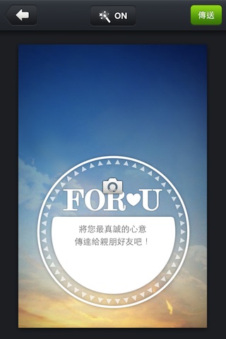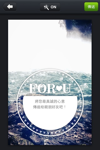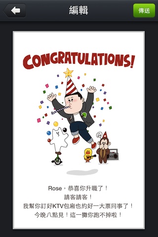 選定想要送出的卡片後,點選它就可以進入編寫卡片內容的步驟。在你嘔心瀝血地寫下了你真心祝福的話語後,就可以直接透過LINE通訊軟體傳送你的心底話囉!但要特別注意的是,LINE需要升級到2.0版本之後才支援這項功能!