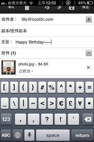 如果你所要寄送朋友還沒有加入LINE也沒關係,透過通訊軟體一般都具備的傳送照片功能,我們依舊可以將剛才儲存到相簿當中的電子卡片給寄出!此外,我們當然也可以透過電子郵件,以附件的方式送出你的心意!
