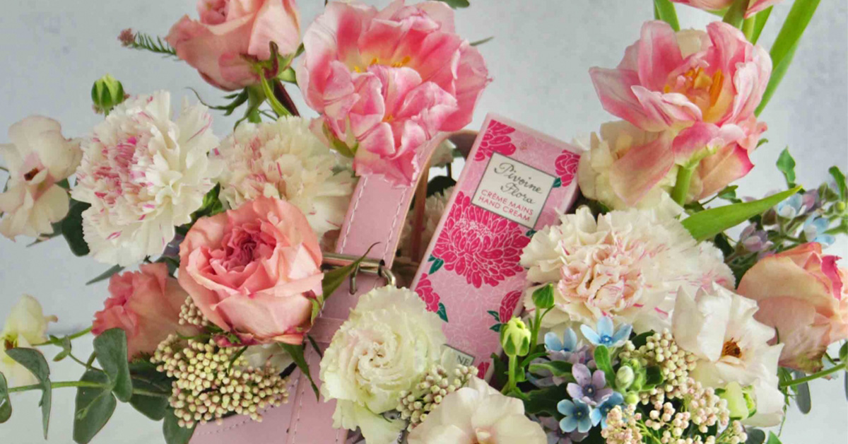 L’OCCITANE歐舒丹與文華國際花苑推出的母親節花禮服務,針對三款人氣保養香氛推出限定花禮,第三款為歐舒丹最具人氣的護手霜,蘊含牡丹精萃、乳油木果油與向日葵籽油,豐潤滑順質地能滋養柔嫩雙手肌膚,L’OCCITANE嶄新詮釋嬌俏牡丹的經典魅力香調,捕捉稍縱即逝的花朵盛放瞬間,以源自南法德隆的牡丹精萃,融合大自然的綠意清香,雙手飄散柔美清新芬芳。文華國際花苑精心設計玫瑰、陸蓮、康乃馨、 藍星花 、桔梗及米香,猶如曙光中甦醒的花朵姿態,嬌嫩的粉紅花瓣怦然綻放,華麗姿態宛若優雅女性的完美化身,此時,照顧媽媽柔嫩雙手同時香氛滿溢,更是幸福滿滿!
