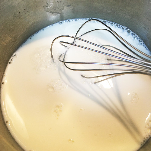 將砂糖加入牛奶中,熱度大約是砂糖融化的程度就可以了。