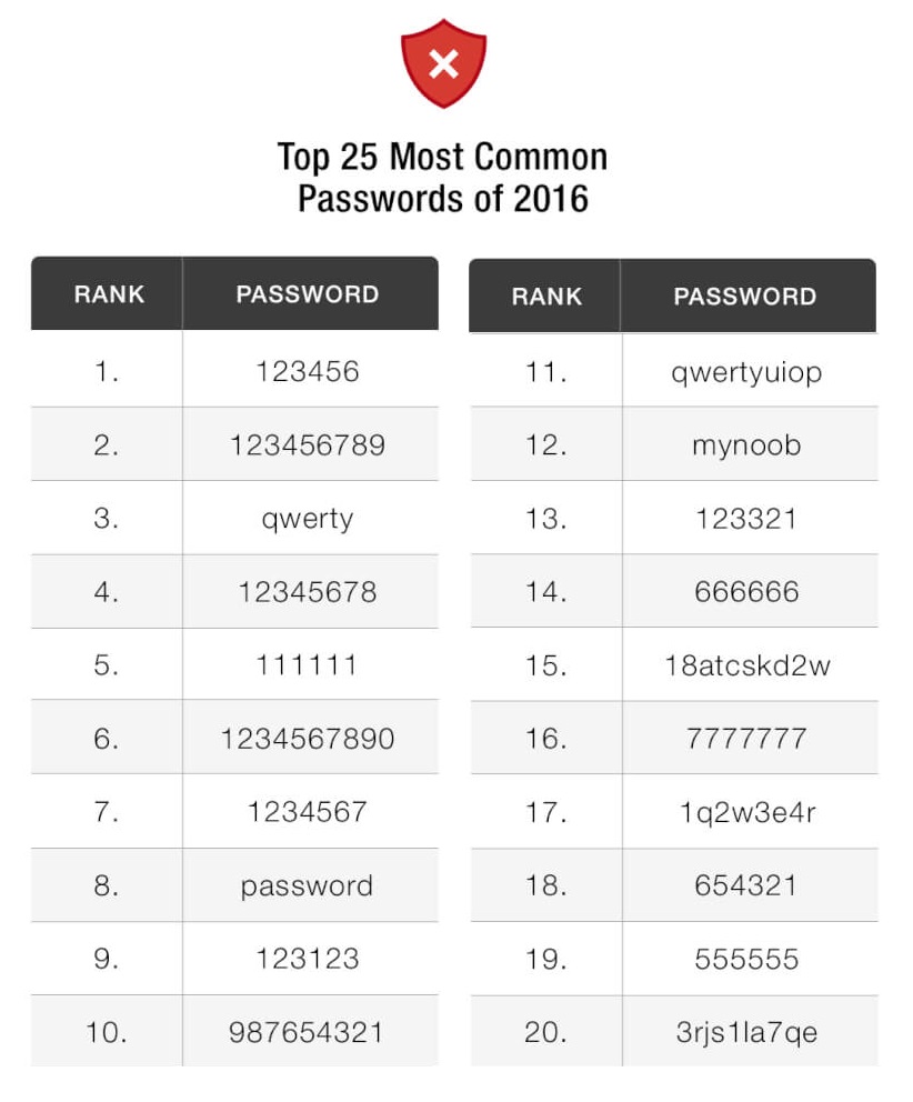 根據《Keeper Security》2016年的「最常見密碼」排行榜,第一名的密碼組合是「123456」,在1億組的密碼中,有17%的用戶都會用這薄弱到不行的6個數字保護自己重要的個資。